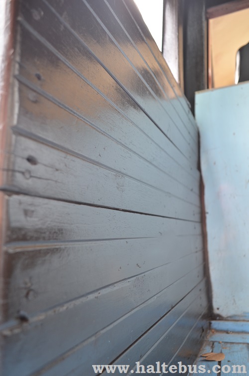 Setiap bagian bus kayu itu sangat khas. Di bagian pintu misalnya, rangka pintu terbuat dari kayu. Dibuat presisi sesuai dengan rumah pintu yang menyatu dengan badan bus. Di bagian dalam pintu dilapisi plat logam tipis, begitu juga di bagian luar pintu. Oh ya, bus kayu ini dibalut plat tipis di bagian luarnya. Jika dilihat dari sisi depan akan kentara bentuk dindingnya yang menggembung. Di bagian atap, ada rak barang yang cukup besar karena memanjang dari belakang kabin pengemudi hingga mencapai buritan bus.