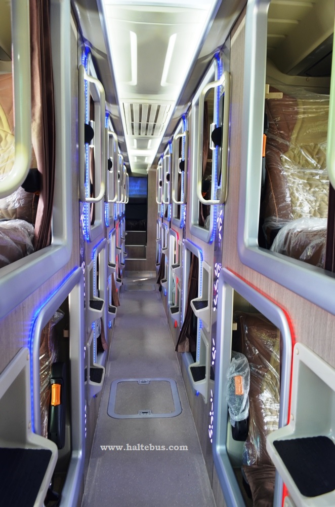 Jika dibandingkan dengan bus konvensional, dengan chassis yang sama, ruang tengah bagasi sedikit lebih sempit. “Lantai bus bagian tengah diturunkan, bagasinya sedikit kami kurangi ruangnya. Di kabin penumpang, sangat terasa lebih lapang,” begitu dia menjelaskan.Mario menambahkan, interior bus dibuat dengan standar Karoseri Adiputro. Sederhana, namun terlihat mewah. Konsol di bibir ruang masuk penumpang juga didesain sendiri, demikian juga dengan tangga naik yang lebar dibuat fungsional. Ada pula saklar yang bisa menandakan kapsul terisi penumpang atau tidak. Jika penumpang sudah masuk ke dalam kapsul, tinggal pencet saklar dan lampu diseputar konsol bibir kapsul akan berubah merah. Jika kosong lampu berwarna biru. “Kalau tirai tertutup kan tidak terlihat ada orang di dalam. Kami beri lampu pembeda, jadi memudahkan ruang kapsul terisi atau kosong,” kata Mario.