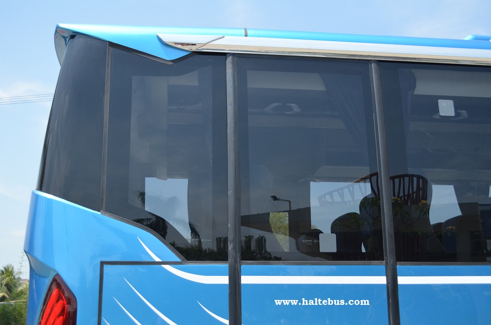 Di sisi samping, terutama di bagian atas, membentang aksen profil yang dibuat dari aluminium ekskursi yang fungsional. Tampilannya yang mengilap dan memanjang juga diiringi dengan fungsi sebagai talang air di saat hujan. Dari aspek keamanan berkendara, kabin pengemudi didesain dengan jangkauan pandangan yang luas untuk pengemudi. “Seperti motto Karoseri Laksana, kami selalu menghadirkan yang berbeda, terdepan, kokoh dan desain yang modern,” ujar Riri.
